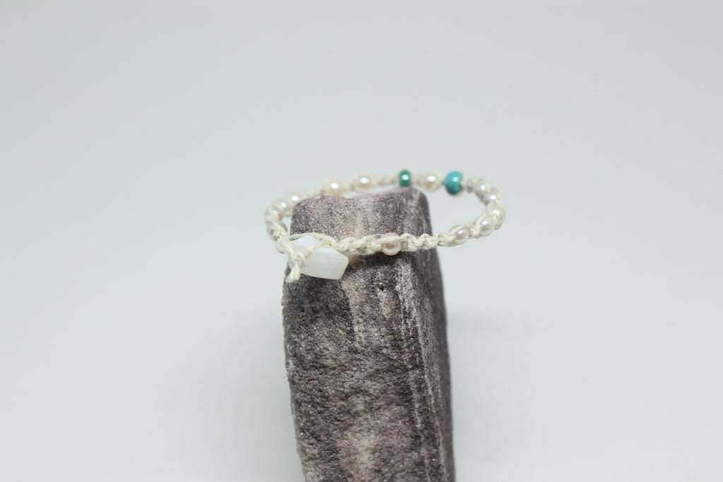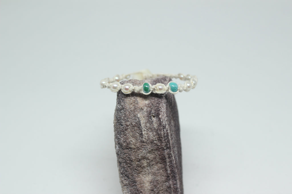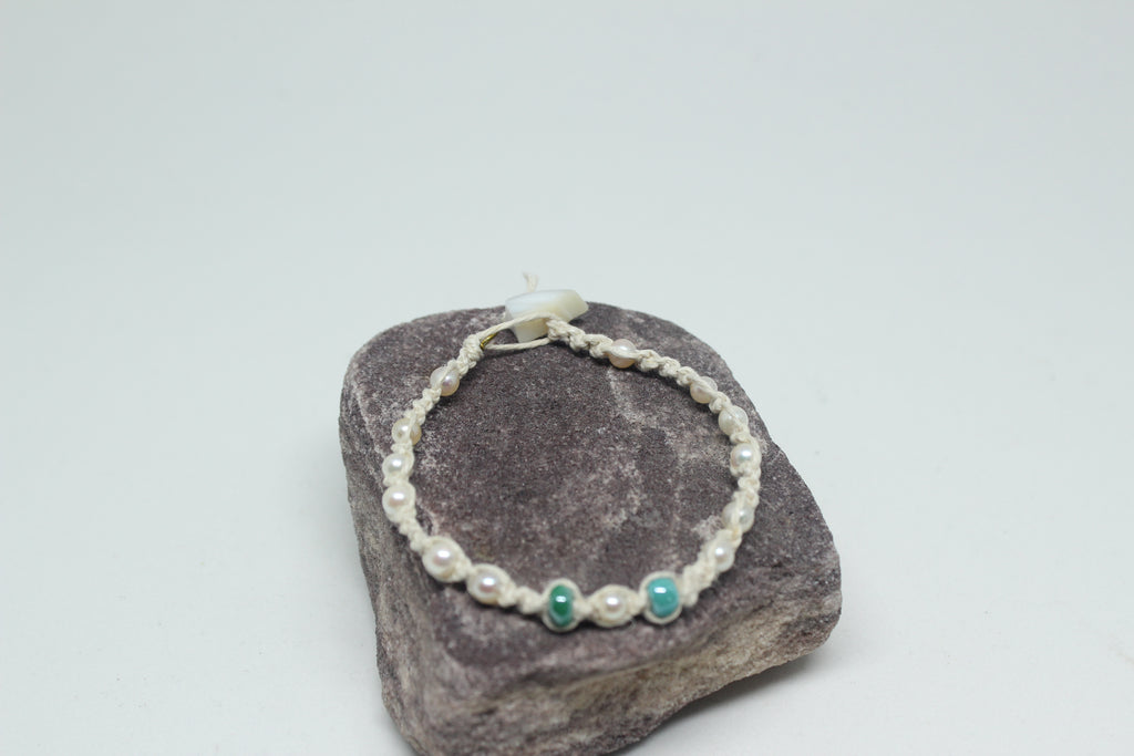 Real Tumbled Pearl Beads and Hemp Bracelet. All materials locally sourced. Beautiful pearl beads weaved with hemp and 2 green glass beads creating a beautiful and soft piece of jewelry. Shell bead at the closure.