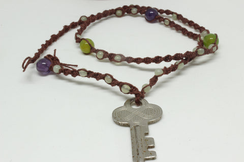 Handmade with thrifted green and purple glass beads + antique key about 1" in diameter