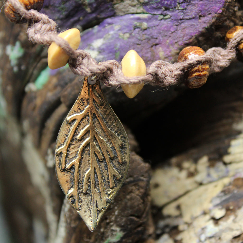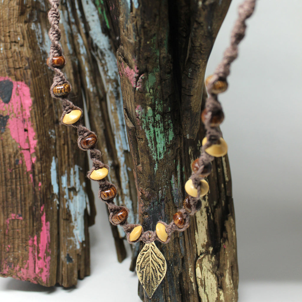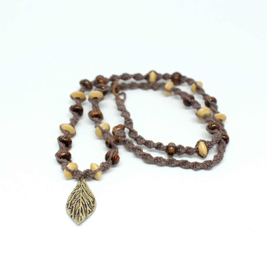 NecklaceEco-friendly organic hemp | colouredHandmade with thrifted wooden beads and 1-inch leaf pendantAll materials are locally sourcedApprox. 23.5" in total lengthCrafted: April 2017