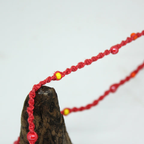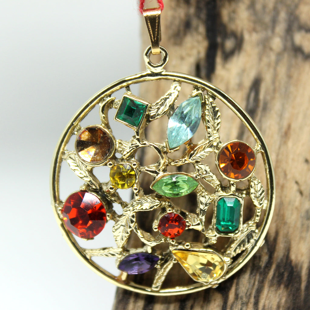 Handmade with thrifted red, orange, yellow glass beads and a gold plated wired pendant about 1" in diameter + petal shaped jewels