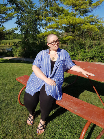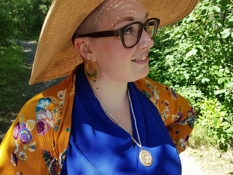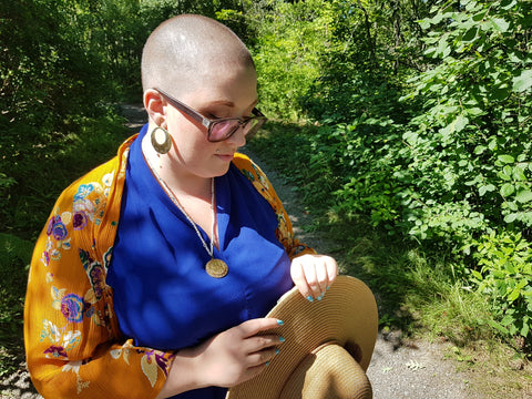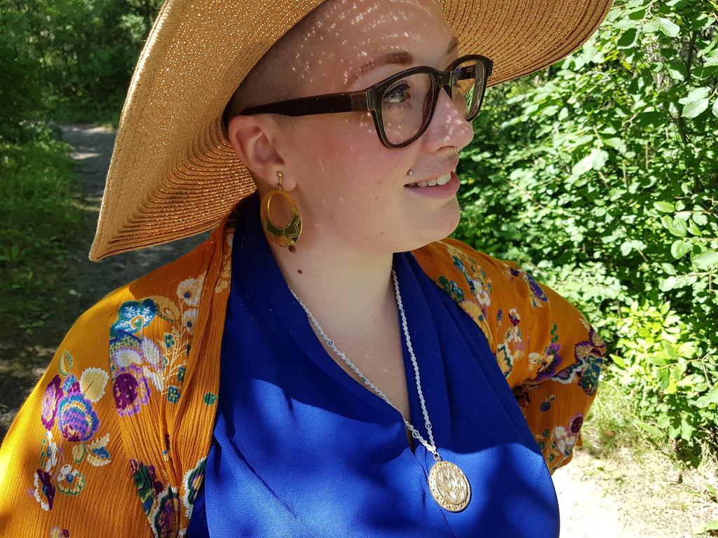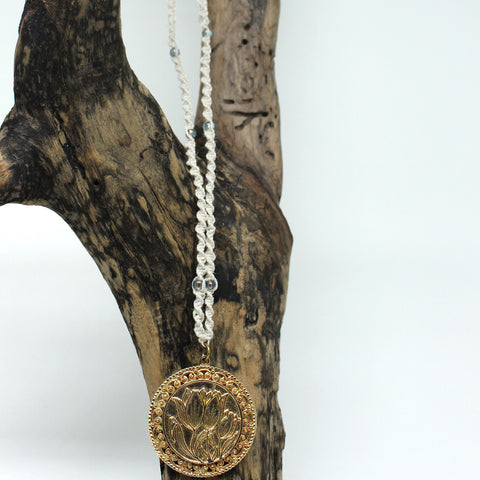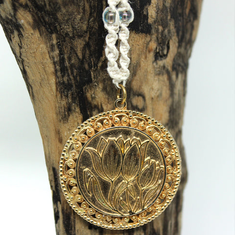 NecklaceEco-friendly organic hemp | colouredHandmade with thrifted blue gold-toned glass beads and bronze plated tulip pendant about 1" in diameter.All materials are locally sourcedApprox. 18" in total lengthCrafted: February 2017