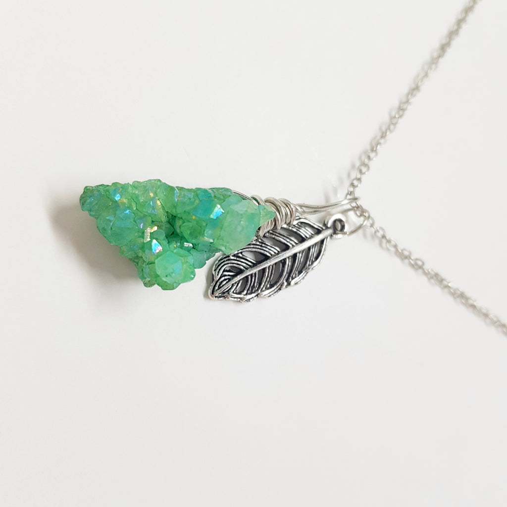 Beautiful, shinmering green druzy quartz pendant hand wrapped with 20 gauge wire, complimented and balanced with a pewter leaf.