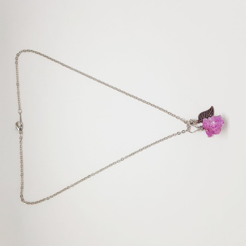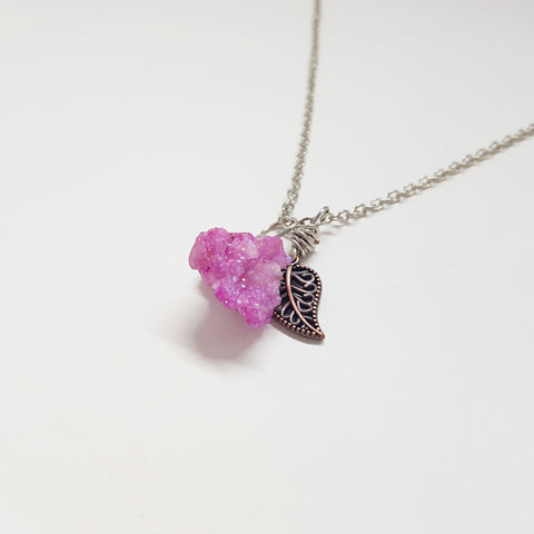 Shimmery sweet pink druzy quartz balanced with a cute pewter leaf. Balancing between the stars and the earth; human made pewter pendant and a natural raw druzy quartz.
