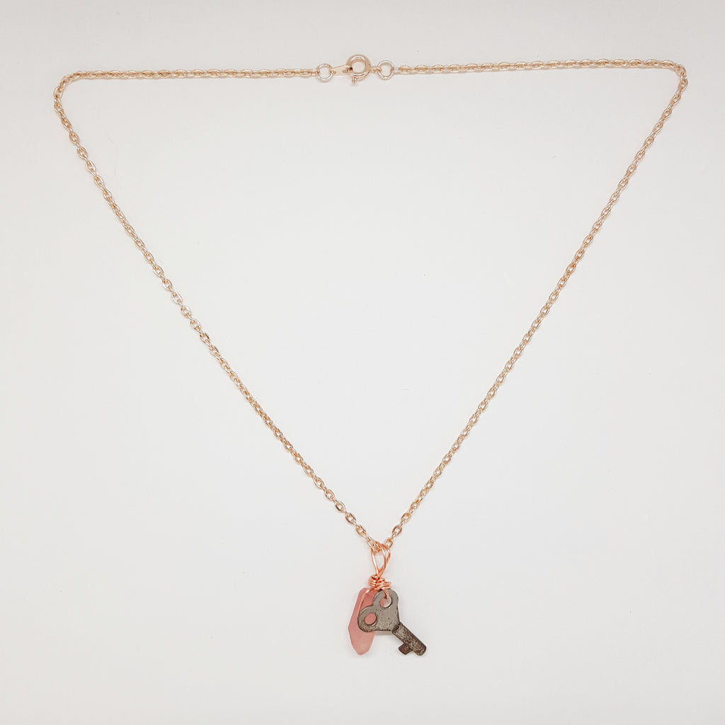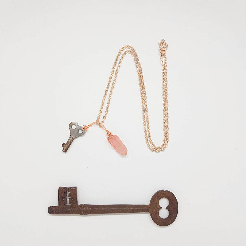Sweet pink quartz paired with antique key. Inspired by the journey towards balance between home and solitude, with dreaming and exploring.