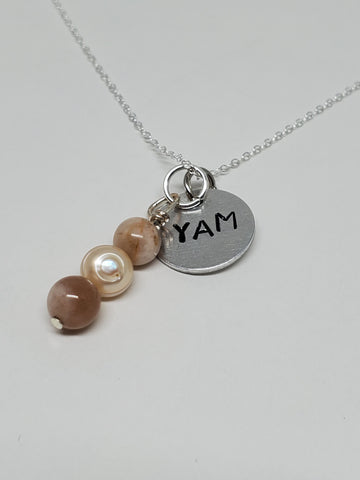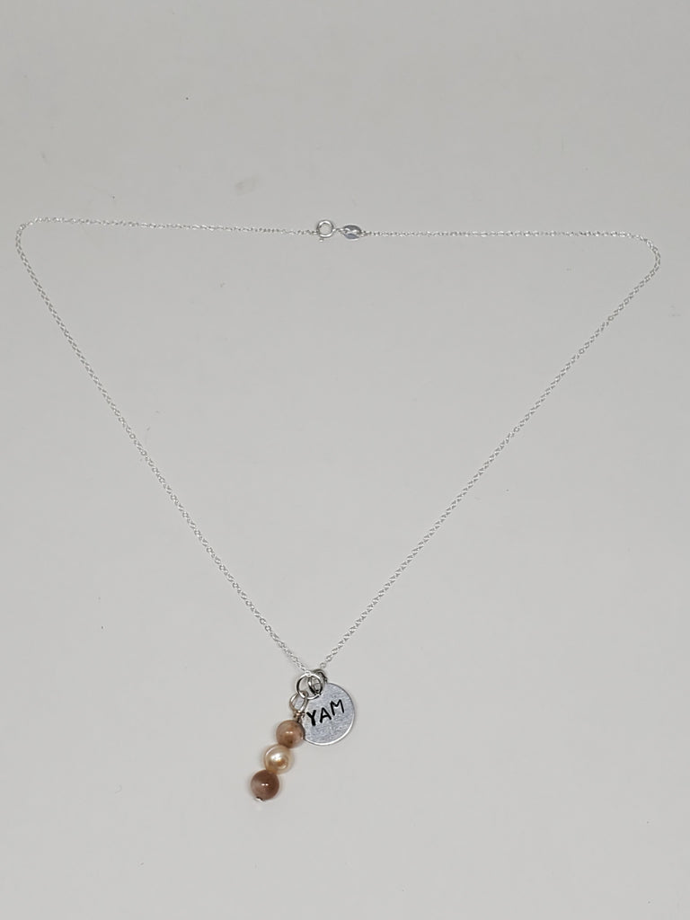 Sunstone, Pearl, Druzy + Hand stamped Chakra Mantra tag <3